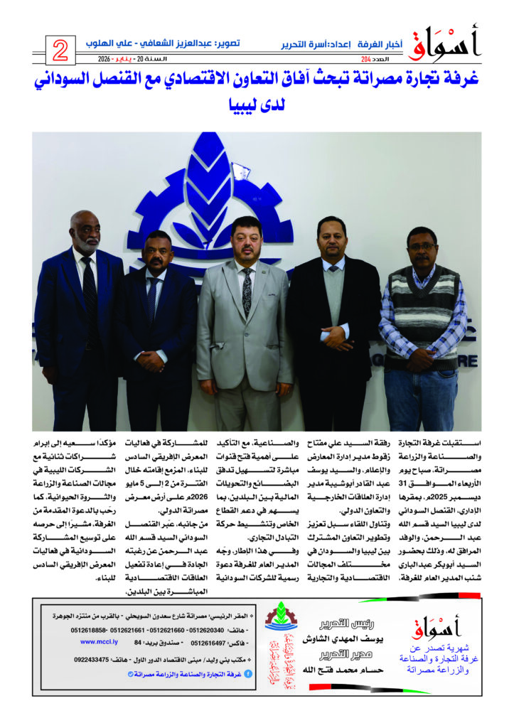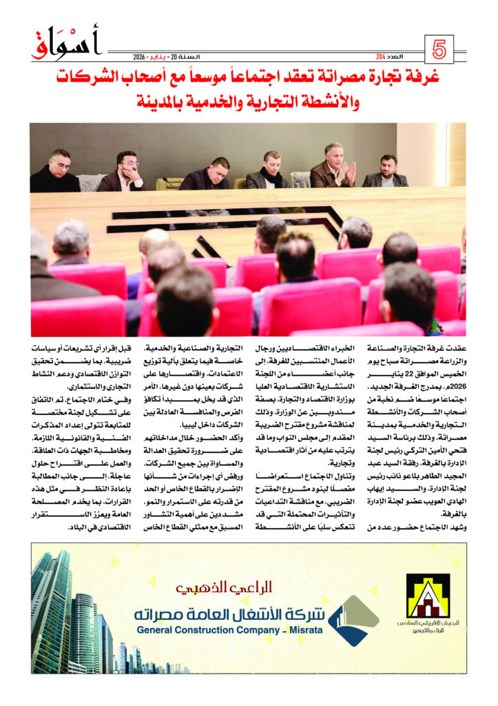 عقدت لجنة الإدارة بغرفة التجارة والصناعة والزراعة مصراتة اجتماعها العادي الأول لسنة 2026م صباح يوم السبت الموافق 07 – فبراير 2026م وذلك لمناقشة أهم مستجدات العمل بالغرفة واستعراض التقارير المالية الشهرية ، كما ناقشت اللجنة أيضاً أخر أعمال التشطيبات للمبنى الإداري الجديد للغرفة.